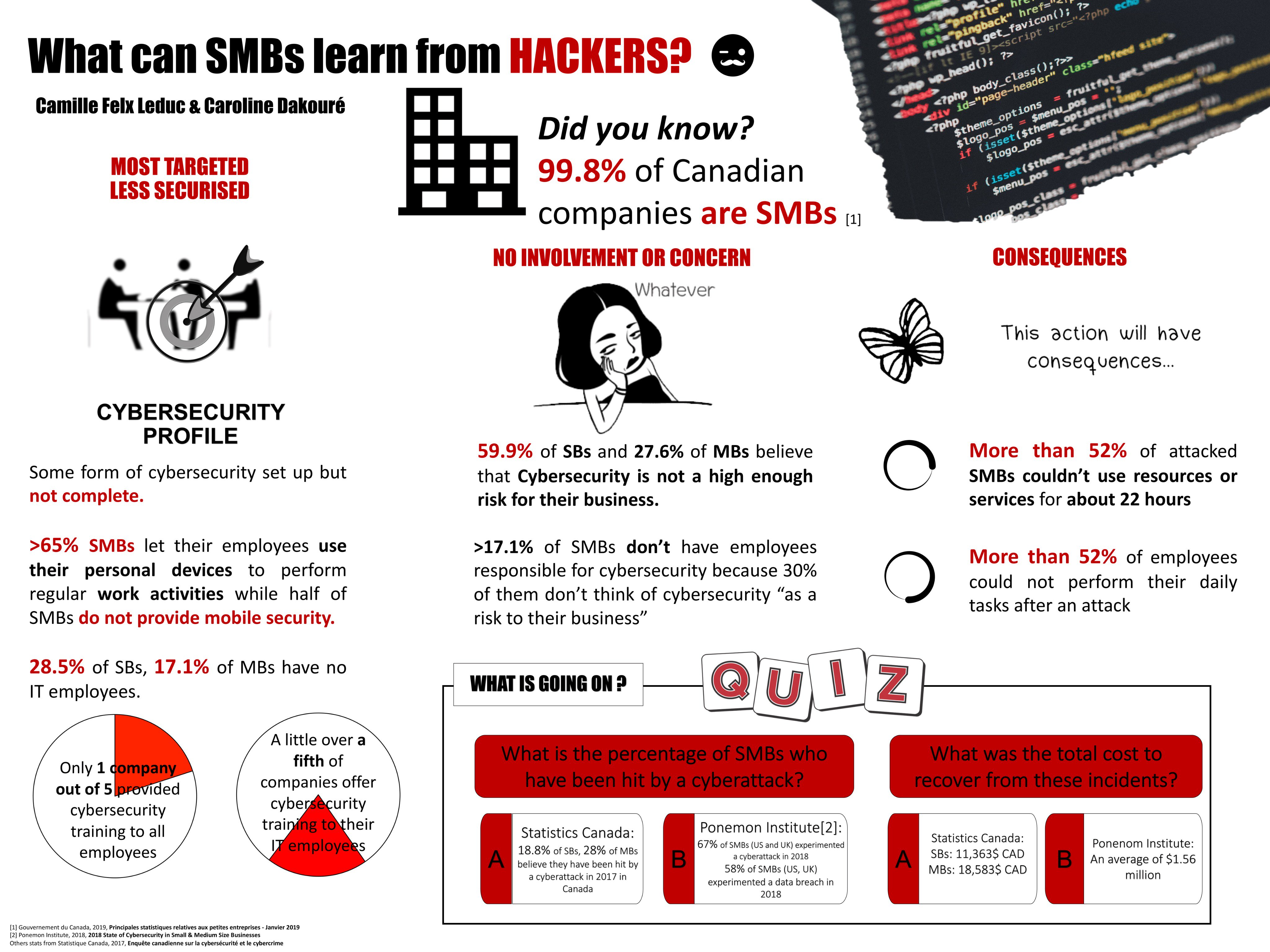 We used cybersecurity and business statistics from Statistics Canada, the Government of Canada, and the Ponemon Institute to communicate cybersecurity issues affecting small and medium-sized businesses.